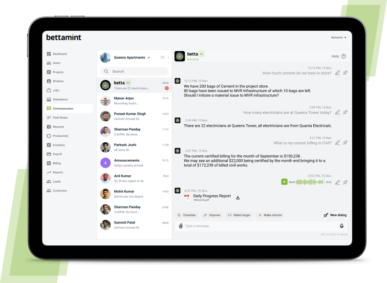 Betta.AI is your intelligent construction companion, delivering real-time insights and instant answers to keep your project moving efficiently. From field to boardroom, it keeps you informed, proactive, and fully in control—helping you make faster, smarter decisions at every stage of your project. With its voice and text-enabled interface, Betta.AI transforms how construction professionals manage projects—faster, smarter, and more profitably.